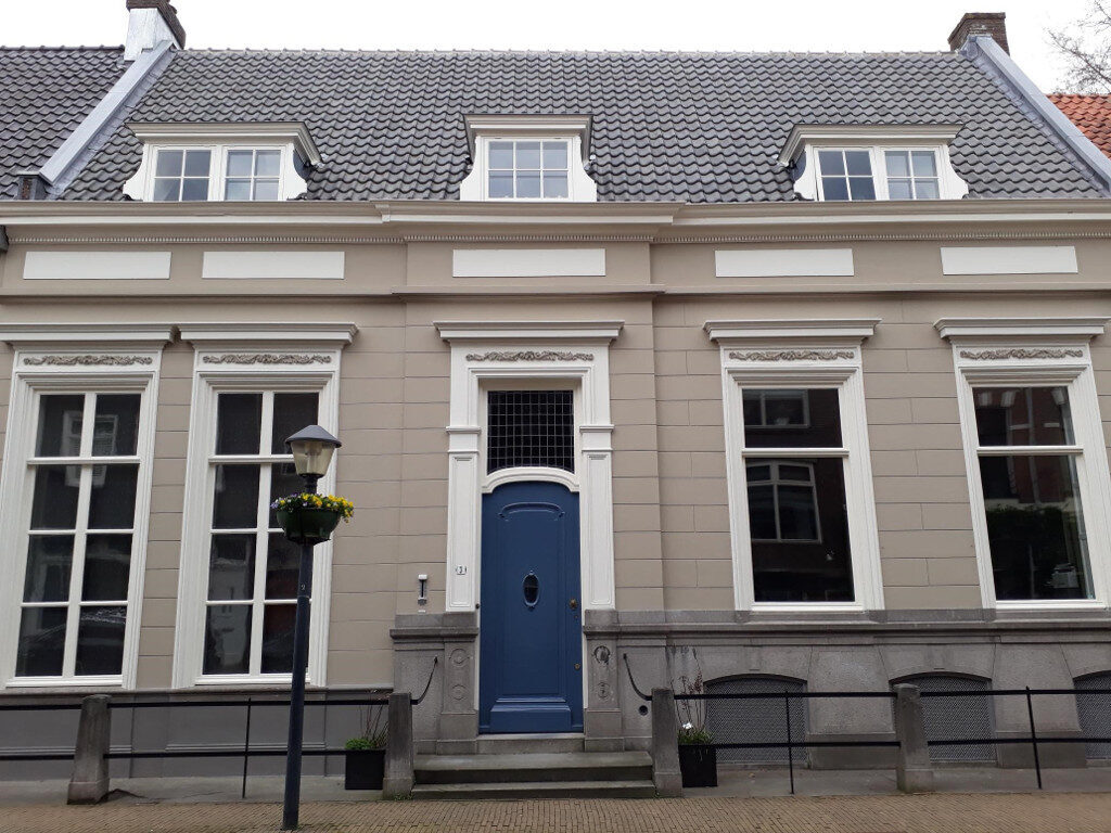 Winnaar van de Stadsherstel publieksprijsHet pand is gebouwd in de eerste helft van de 18e eeuw. Het achterhuis is van later datum. In de loop der tijd is de kapconstructie een aantal keer gewijzigd. Het pand heeft een garage aan het Zusterhuis die rond 1920 gebouwd is. In de enorme tuin, die tot aan de Zusterstraat loopt wordt eind jaren 20 een stapelmuurtjestuin aangelegd. Een typisch Engelse stijl met perken van allerlei gestapeld materiaal. In de jaren 30 wordt nog een keer de kapconstructie vernieuwd. Vanaf de jaren 80 heeft het architectenbureau van Aart van Eck hier lang kantoor gehouden.
